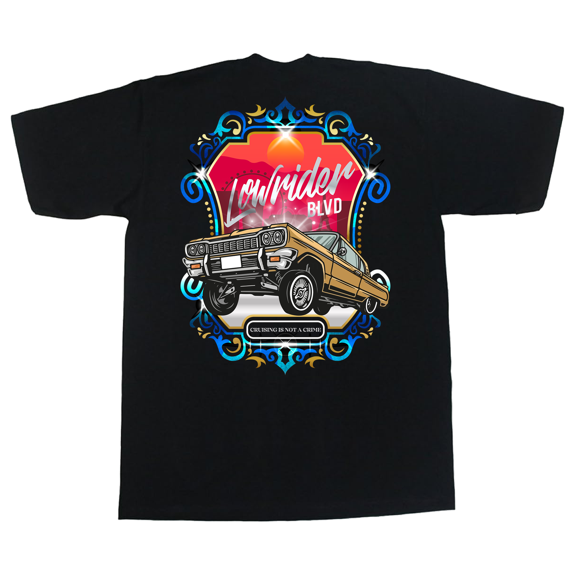 City Lights. Design is on the back with the Lowrider Blvd logo on the front left chest area. 100% Cotton Shirt.