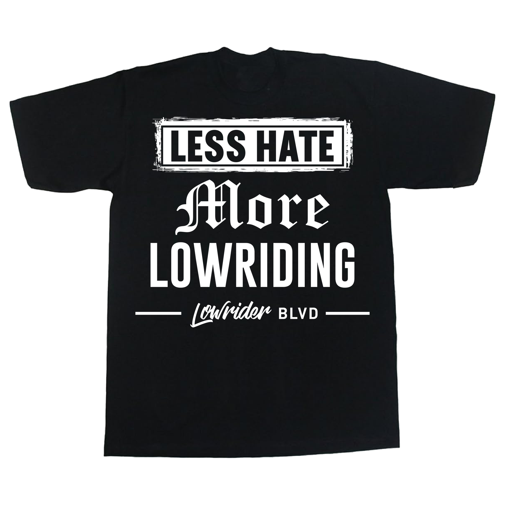 Less Hate More Lowriding. Design is on the front with the Lowrider Blvd logo on the 100% Cotton Shirt