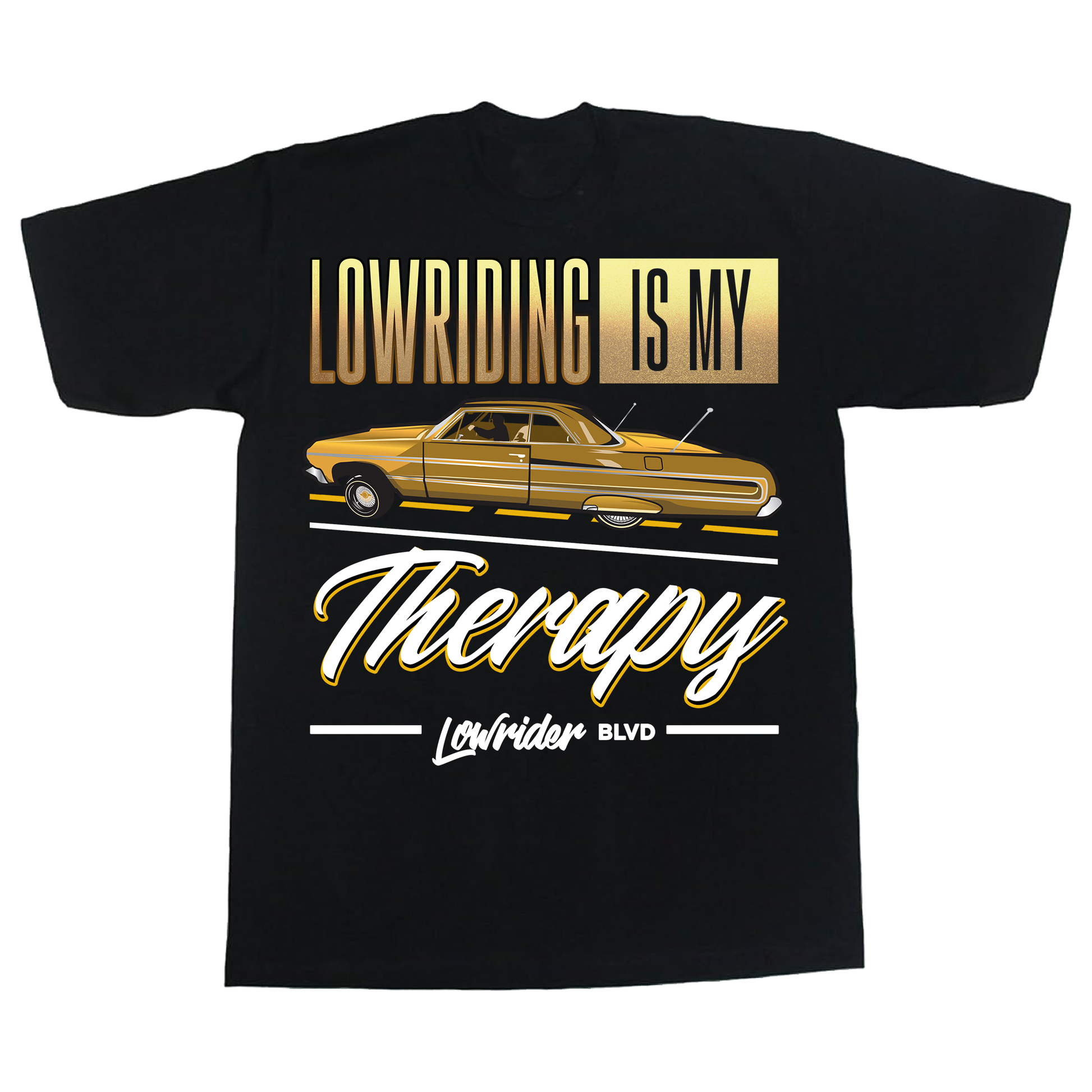 Lowriding Is My Therapy. Design is on the front with the Lowrider Blvd logo on the 100% Cotton Shirt